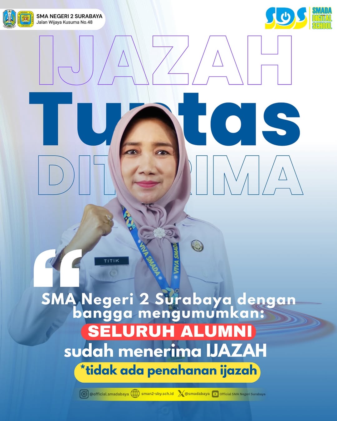 Pengumuman ini ditujukan kepada seluruh warga sekolah, terutama para alumni, serta media massa untuk memberikan kepastian dan transparansi. Dra. Titik Hariani, M.M. menegaskan bahwa SMA Negeri 2 Surabaya telah menerapkan aturan sesuai dengan regulasi yang berlaku, termasuk Permendikbud Nomor 58 Tahun 2024 dan Persesjen Kemendikbudristek Nomor 1 Tahun 2022 tentang Ijazah, yang secara tegas melarang sekolah menahan ijazah dengan alasan apapun. “Kami pastikan di SMA Negeri 2 Surabaya tidak ada kasus penahanan ijazah. Semua sudah tuntas diterima alumni,” ujar beliau. Pihak sekolah berharap, dengan telah diterimanya ijazah, para alumni dapat melanjutkan langkahnya baik ke jenjang pendidikan tinggi maupun dunia kerja dengan rasa bangga dan tanpa hambatan. Sekolah selalu mendoakan agar alumni dapat meraih cita-cita terbaiknya, serta senantiasa menjaga nama baik almamater tercinta di mana pun mereka berada. Selain itu, lulusan SMA Negeri 2 Surabaya diharapkan dapat menunjukkan kinerja dan kontribusi positif, mencerminkan kebiasaan dan nilai-nilai luhur yang telah diajarkan selama masa studinya di sekolah. (BB)