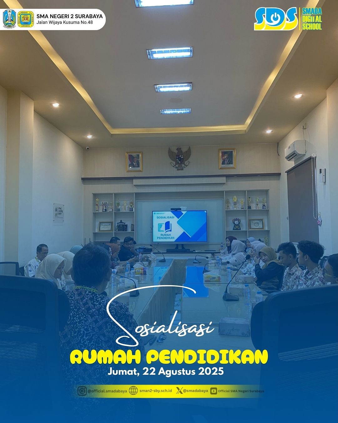 Surabaya, 22 Agustus 2025 – SMA Negeri 2 Surabaya menyelenggarakan sosialisasi resmi platform digital “Rumah Pendidikan” di ruang rapat (Meeting Room) sekolah, Jumat (22/8). Kegiatan yang dihadiri oleh seluruh unsur civitas akademika—guru, karyawan, dan murid—ini bertujuan memperkenalkan inovasi teknologi penunjang sistem pembelajaran dan manajemen sekolah.